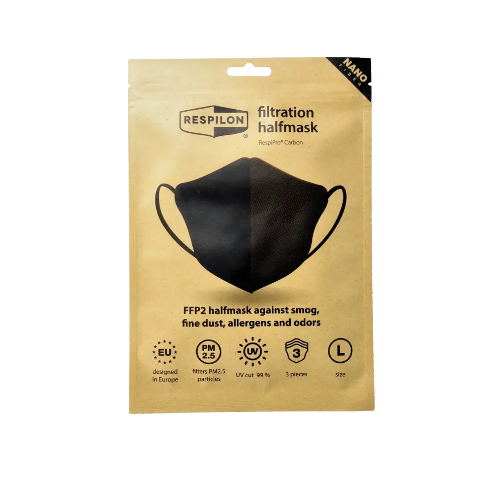 Die RespiPro Carbon FFP2 Nanofaser-Atemschutzmaske schützt Sie vor Viren, Bakterien, Smog und Pollen und beseitigt außerdem unangenehme Gerüche. Dies alles dank der Nanofasermembran und einer Aktivkohleschicht. Die Atemschutzmaske hat eine einzigartige ergonomische Form, weshalb sie perfekt auf jedes Gesicht passt.