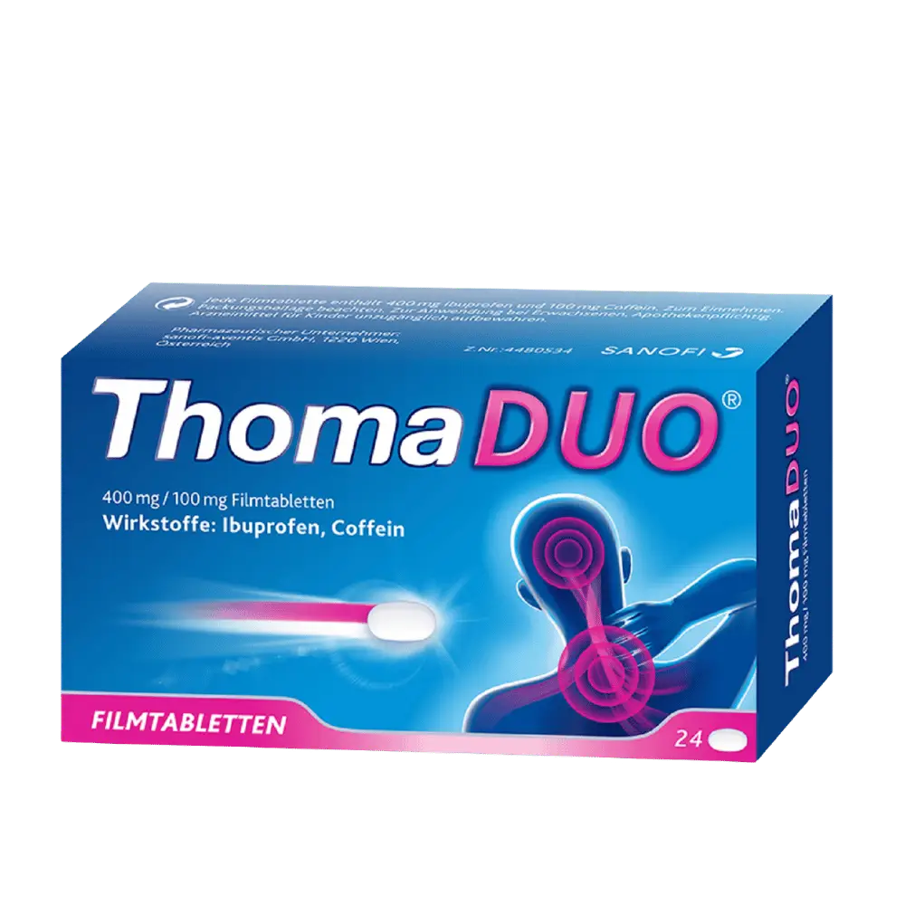 Bei akuten mäßig starken Schmerzen wird die Einnahme von 1 Filmtablette ThomaDuo (entsprechend 400 mg Ibuprofen und 100 mg Coffein) empfohlen. Nach 6–8 Stunden kann eine weitere Filmtablette eingenommen werden, wobei eine Tageshöchstdosis von 3 Tabletten pro Tag nicht überschritten werden darf. Die Behandlungsdauer darf 3 Tage nicht überschreiten.